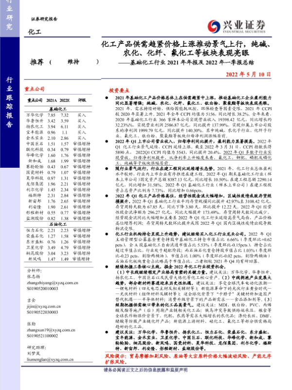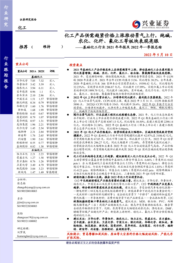 【兴业证券】【20220510】基础化工行业2021年年报及2022年一季报总结:化工产品供需趋紧价格上涨推动景气上行,纯碱、农化、化纤、氟化工等板块表现亮眼-72页