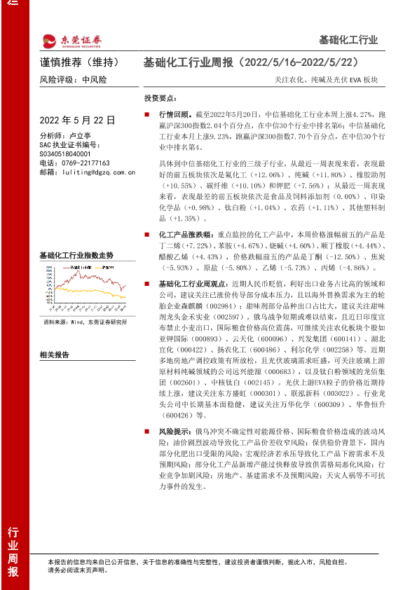 【东莞证券】【20220522】20220522-东莞证券-基础化工行业周报:关注农化、纯碱及光伏EVA板块-11页