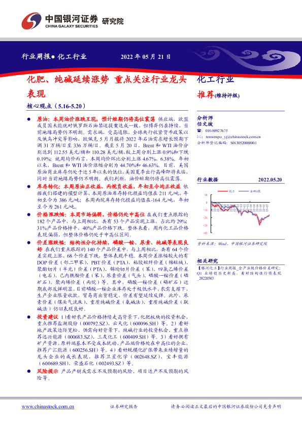 【银河证券】【20220521】20220521-中国银河-化工行业:化肥、纯碱延续涨势 重点关注行业龙头表现-18页