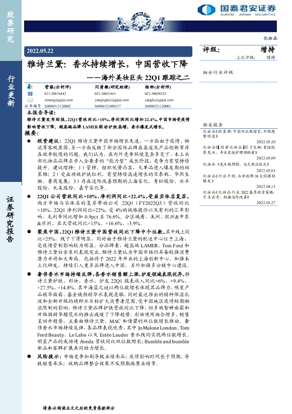 【国泰君安证券】【20220522】20220522-国泰君安-海外美妆巨头22Q1跟踪之二:雅诗兰黛:香水持续增长,中国营收下降-6页