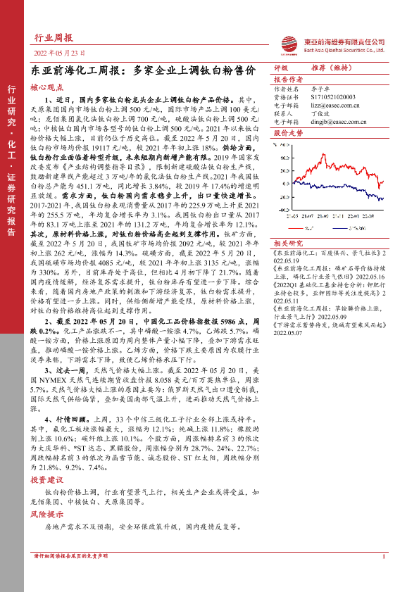 【东亚前海证券】【20220523】东亚前海化工周报:多家企业上调钛白粉售价-22页