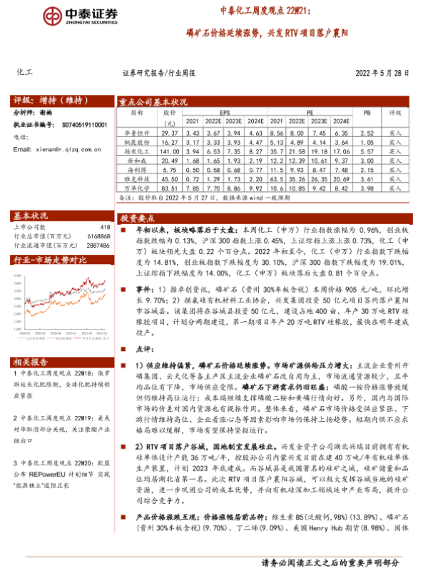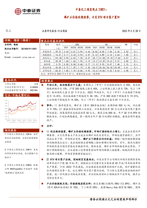 【中泰证券】【20220528】中泰化工周度观点22W21:磷矿石价格延续涨势,兴发RTV项目落户襄阳-25页