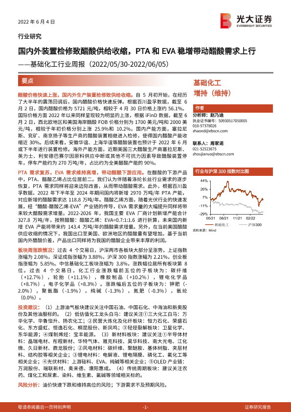 【光大证券】【20220604】基础化工行业周报:国内外装置检修致醋酸供给收缩,PTA和EVA稳增带动醋酸需求上行-28页