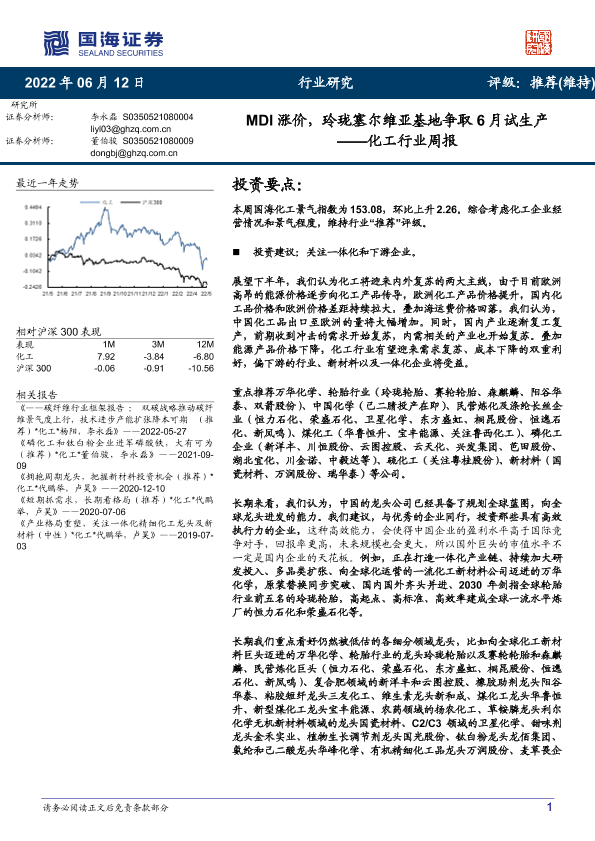 【国海证券】【20220612】20220612-国海证券-化工行业周报:MDI涨价,玲珑塞尔维亚基地争取6月试生产-56页