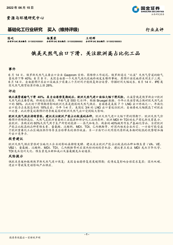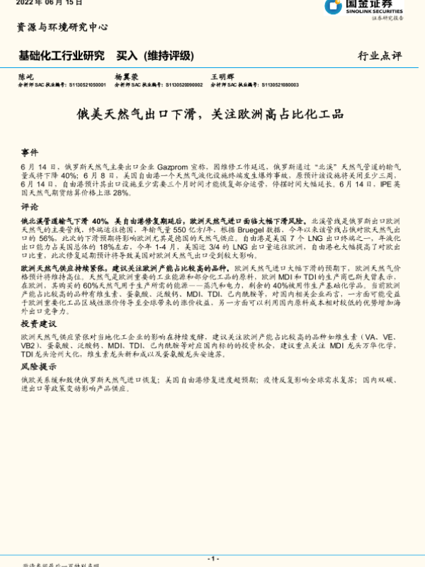 【国金证券】【20220615】基础化工行业研究:俄美天然气出口下滑,关注欧洲高占比化工品-3页