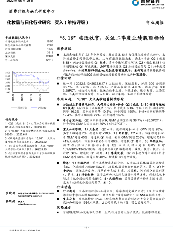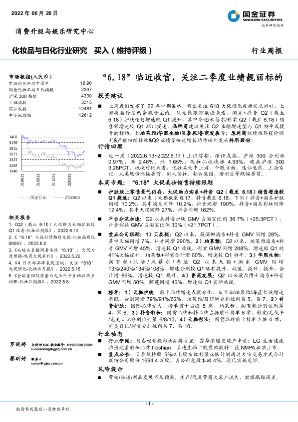 【国金证券】【20220620】20220620-国金证券-化妆品与日化行业研究:“6.18”临近收官,关注二季度业绩靓丽标的-13页