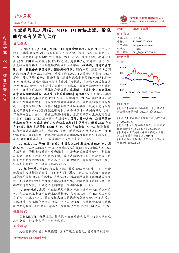【东亚前海证券】【20220620】东亚前海化工周报:MDI TDI价格上涨,聚氨酯行业有望景气上行-22页