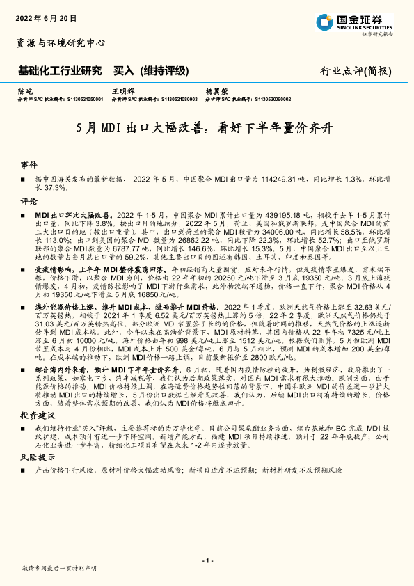 【国金证券】【20220620】基础化工行业研究:5月MDI出口大幅改善,看好下半年量价齐升-3页