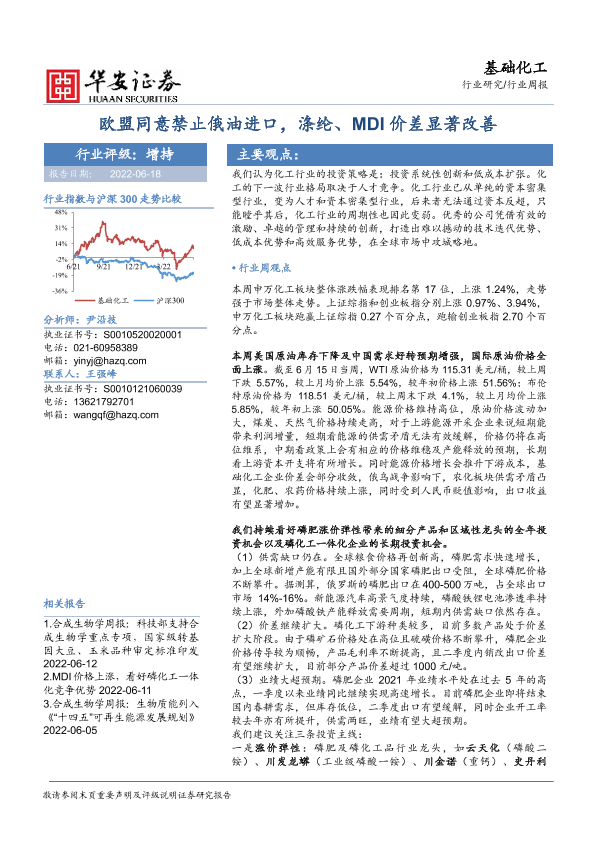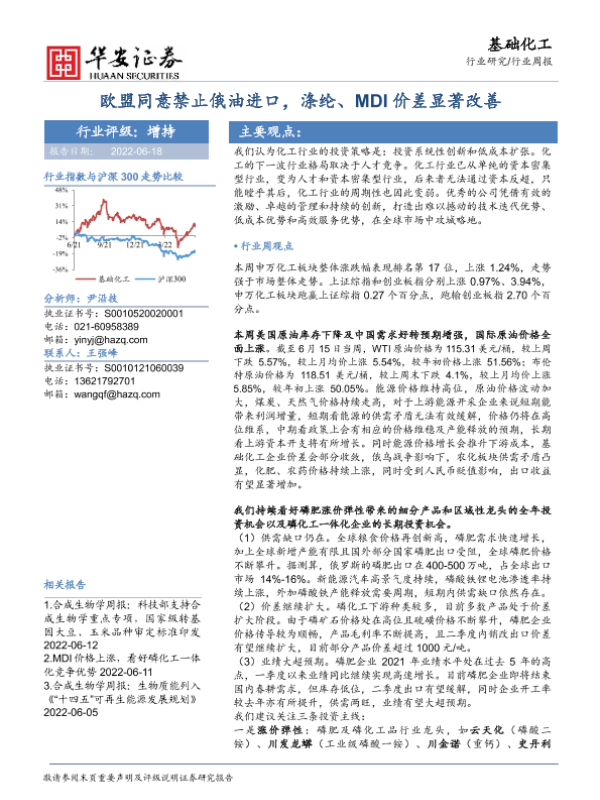 【华安证券】【20220618】基础化工行业周报:欧盟同意禁止俄油进口,涤纶、MDI价差显著改善-42页