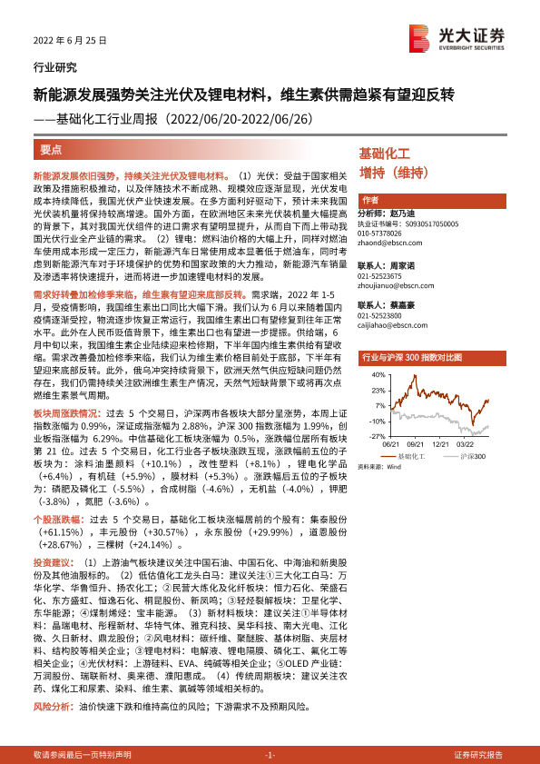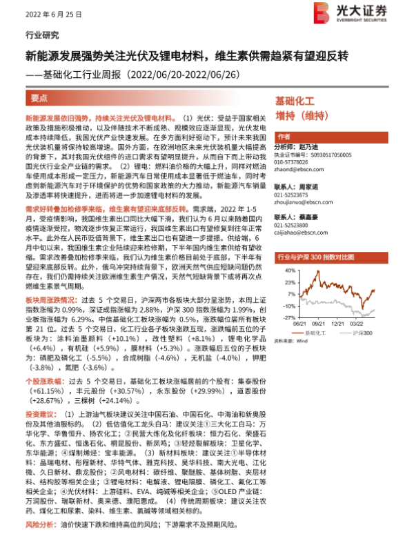 【光大证券】【20220625】基础化工行业周报:新能源发展强势关注光伏及锂电材料,维生素供需趋紧有望迎反转-29页