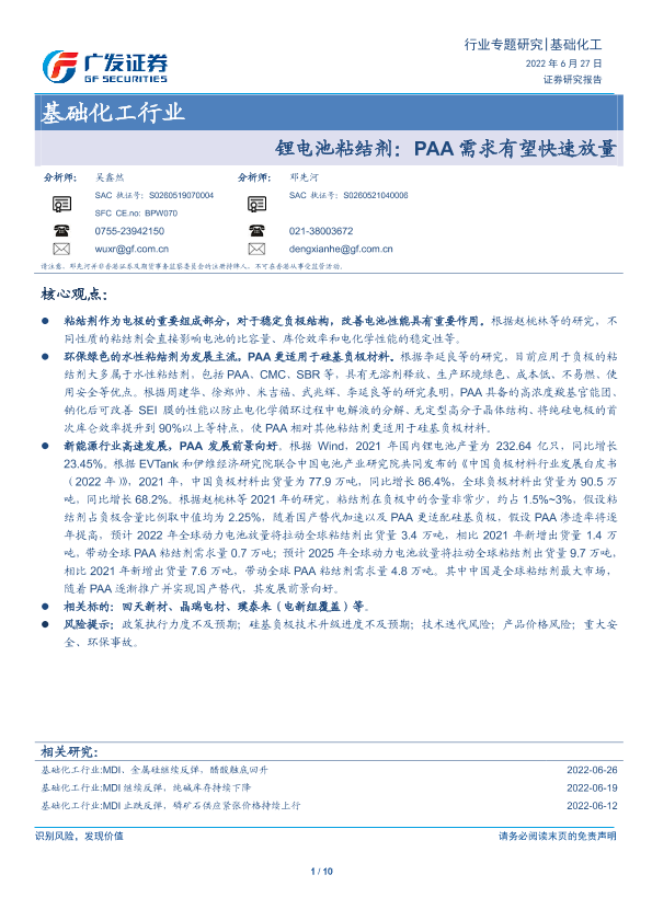 【广发证券】【20220627】基础化工行业:锂电池粘结剂:PAA需求有望快速放量-10页