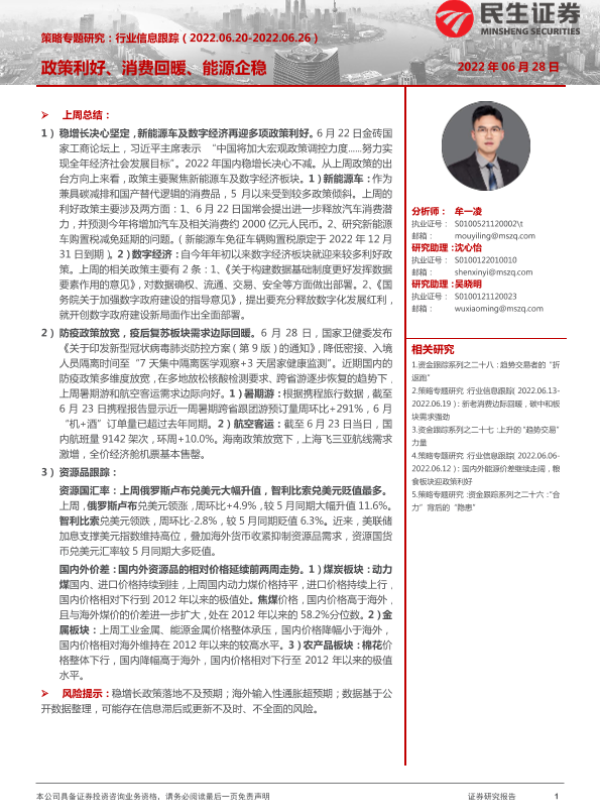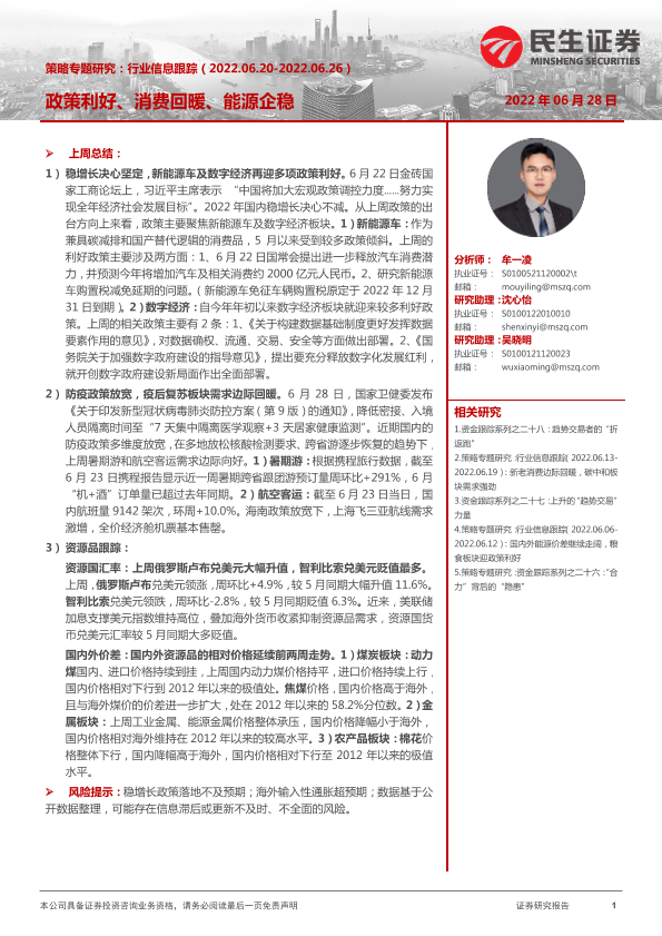 【民生证券】【20220628】策略专题研究:行业信息跟踪,政策利好、消费回暖、能源企稳-26页