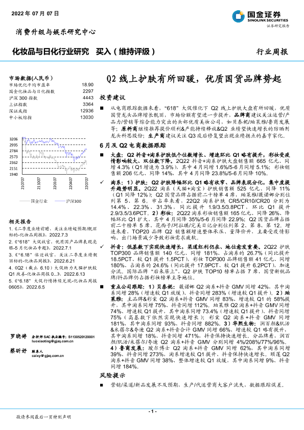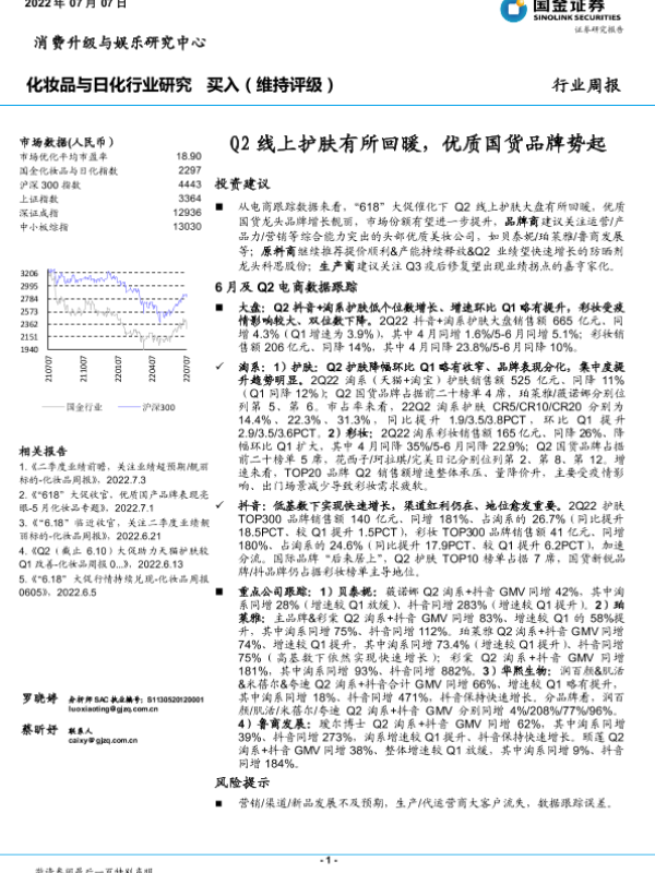 【国金证券】【20220707】20220707-国金证券-化妆品与日化行业研究:Q2线上护肤有所回暖,优质国货品牌势起-19页