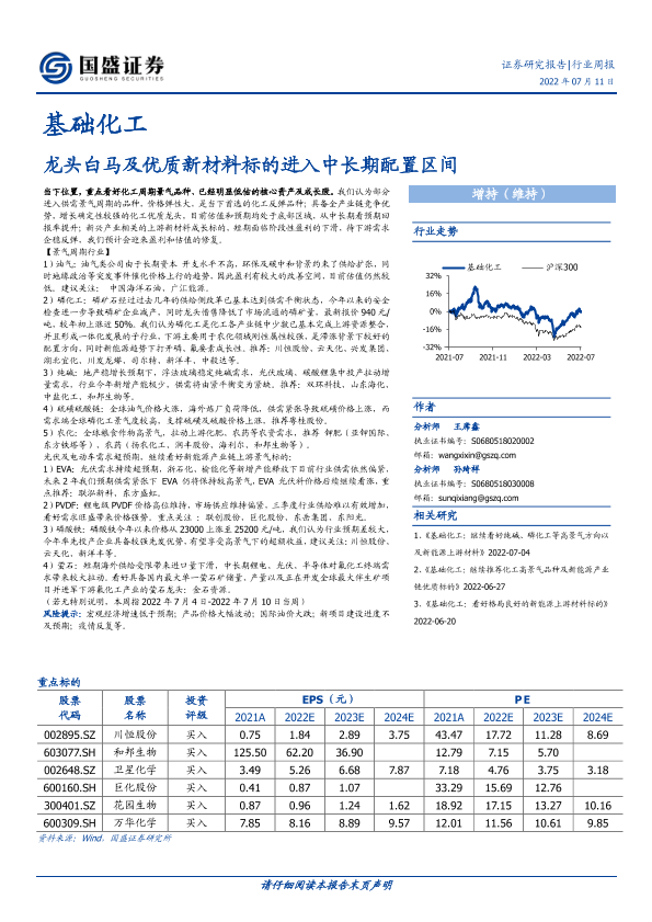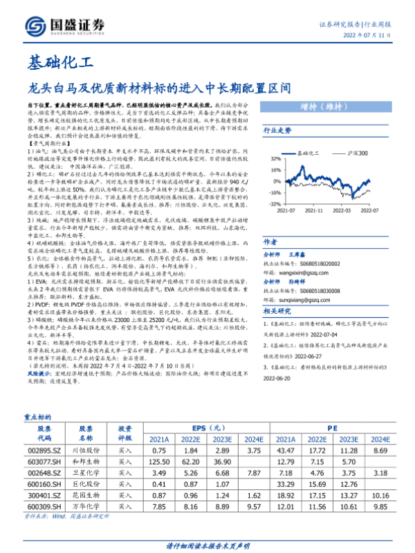 【国盛证券】【20220711】基础化工行业周报:龙头白马及优质新材料标的进入中长期配置区间-13页