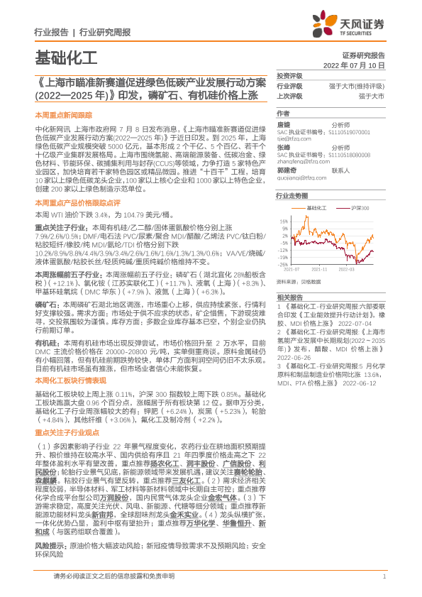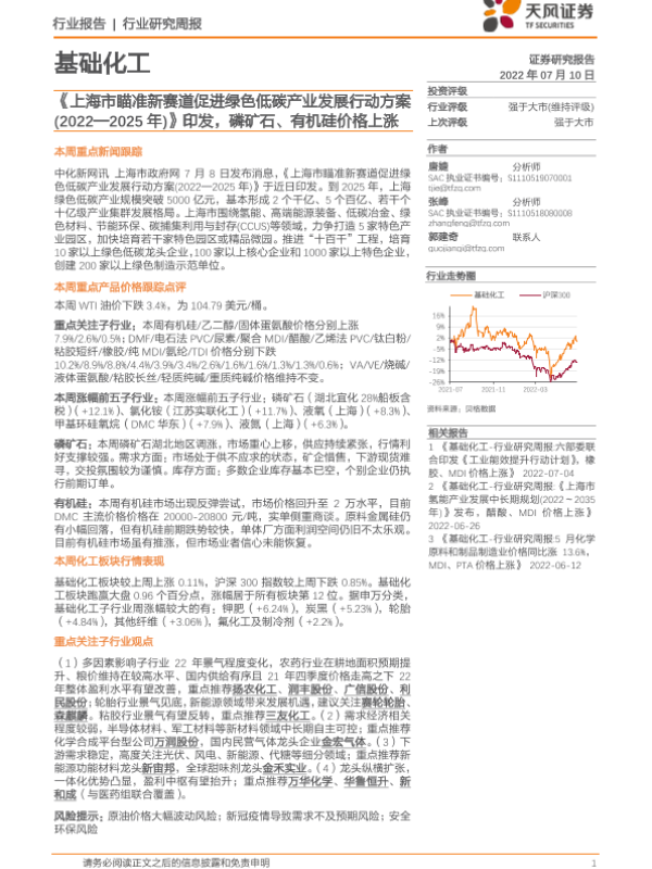 【天风证券】【20220710】20220710-天风证券-基础化工行业研究周报:《上海市瞄准新赛道促进绿色低碳产业发展行动方案(2022—2025年)》印发,磷矿石、有机硅价格上涨-21页