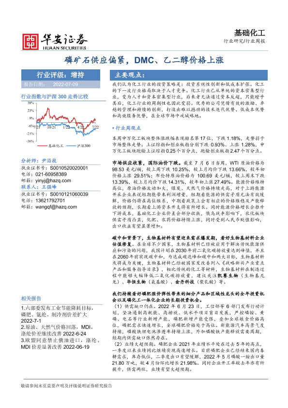 【华安证券】【20220709】基础化工行业周报:磷矿石供应偏紧,DMC、乙二醇价格上涨-42页