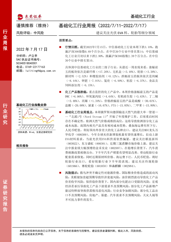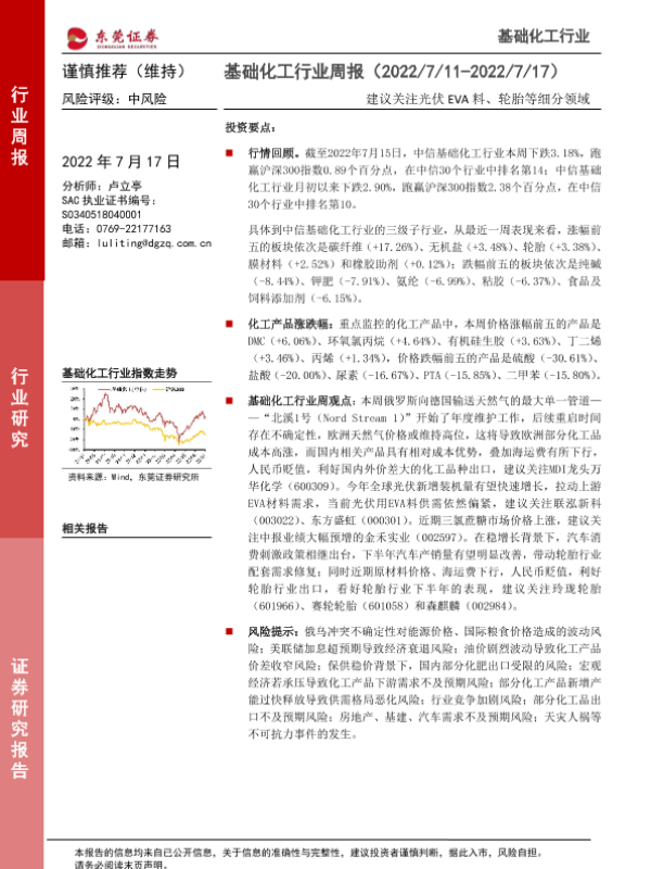 【东莞证券】【20220717】20220717-东莞证券-基础化工行业周报:建议关注光伏EVA料、轮胎等细分领域-12页