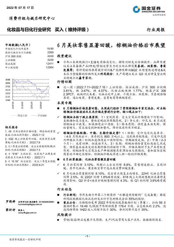 【国金证券】【20220717】20220717-国金证券-化妆品与日化行业研究:6月美妆零售显著回暖,棕榈油价格后市展望-10页