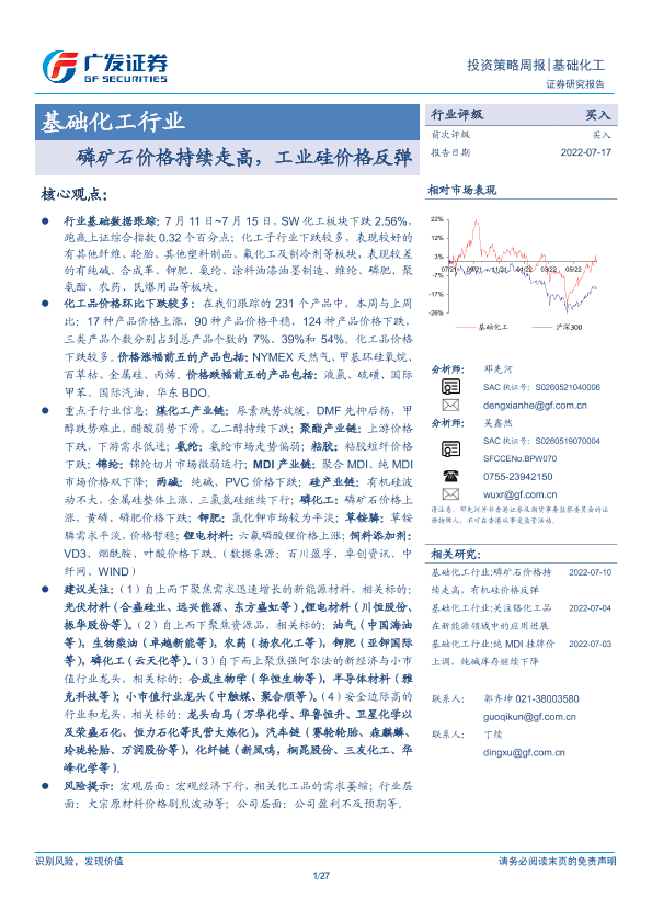 【广发证券】【20220717】基础化工行业投资策略周报:磷矿石价格持续走高,工业硅价格反弹-27页