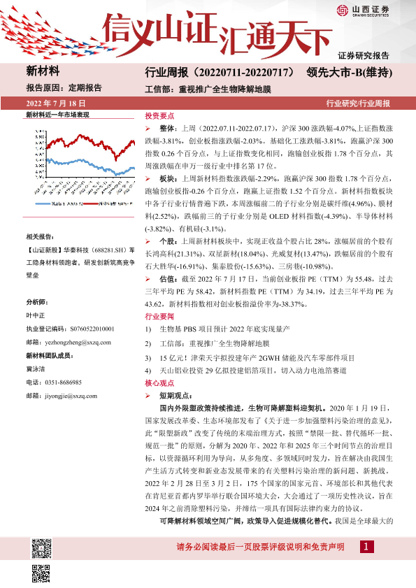 【山西证券】【20220718】新材料行业周报:工信部:重视推广全生物降解地膜-20页