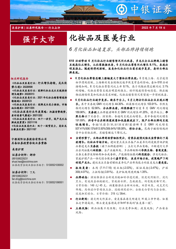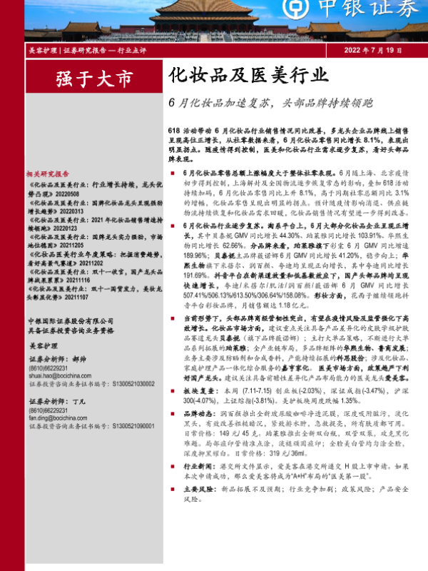 【中银证券】【20220719】化妆品及医美行业:6月化妆品加速复苏,头部品牌持续领跑-16页