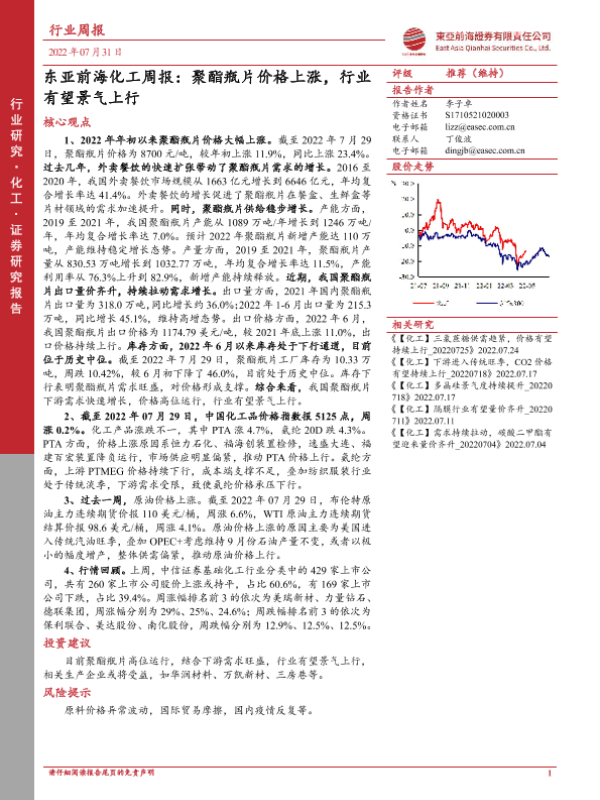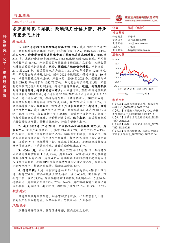 【东亚前海证券】【20220731】东亚前海化工周报:聚酯瓶片价格上涨,行业有望景气上行-22页