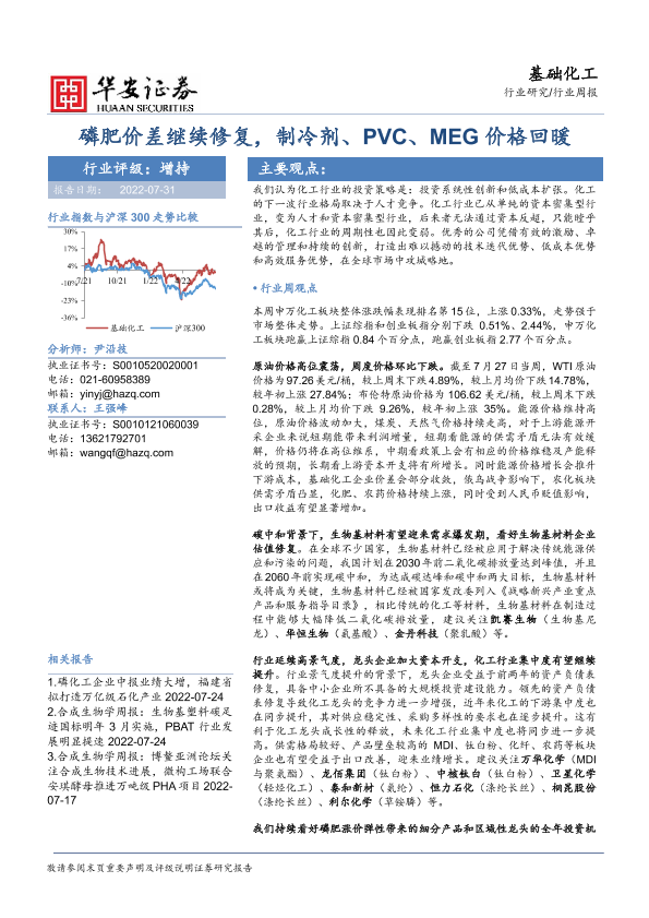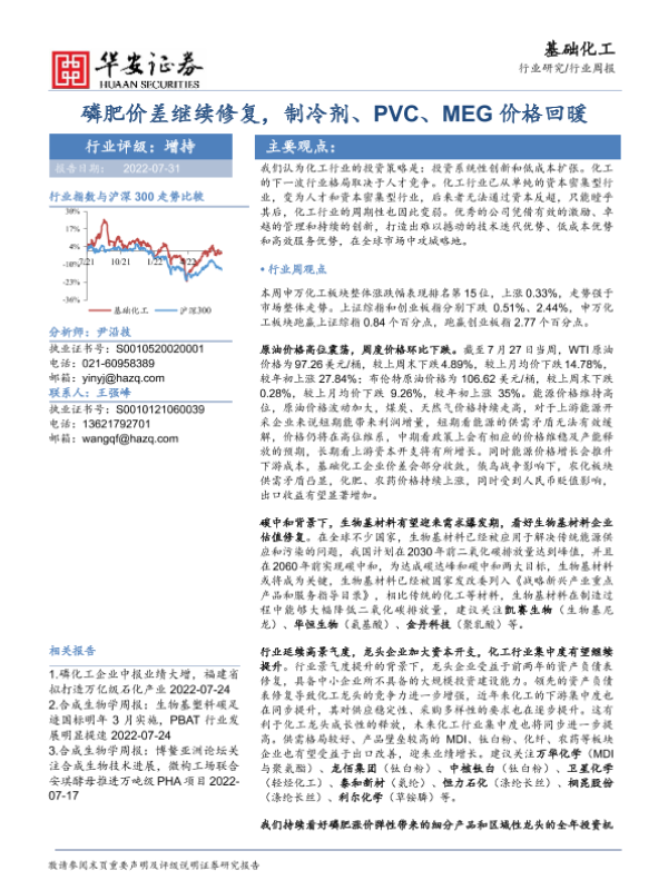 【华安证券】【20220731】基础化工行业周报:磷肥价差继续修复,制冷剂、PVC、MEG价格回暖-41页