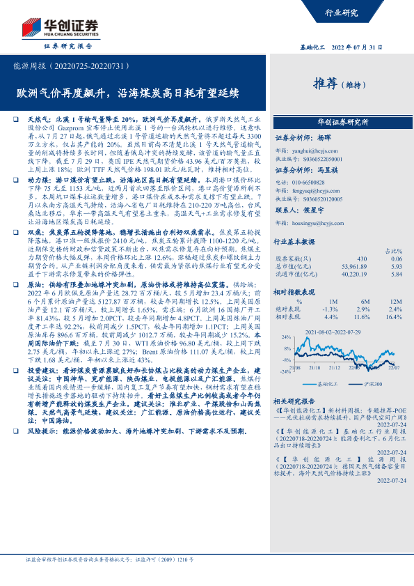 【华创证券】【20220731】20220731-华创证券-能源周报:欧洲气价再度飙升,沿海煤炭高日耗有望延续-18页