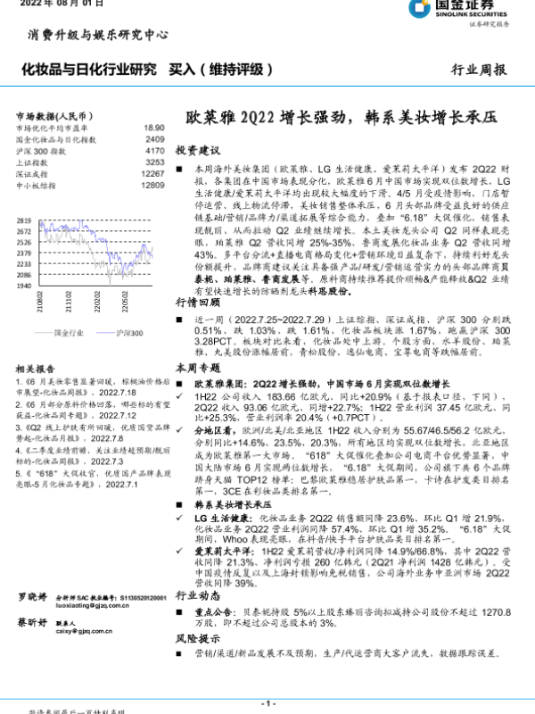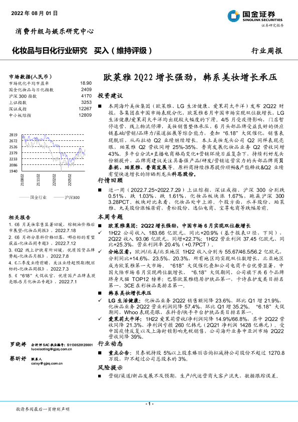 【国金证券】【20220801】化妆品与日化行业研究:欧莱雅2Q22增长强劲,韩系美妆增长承压-9页