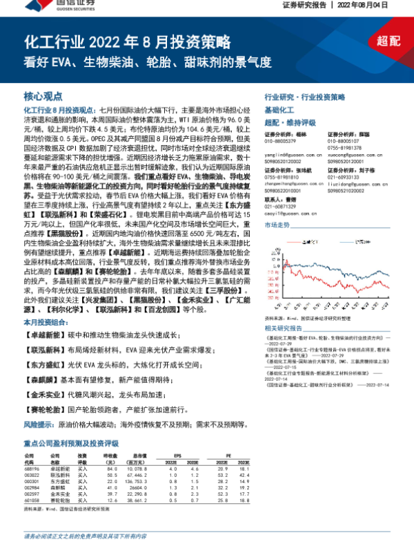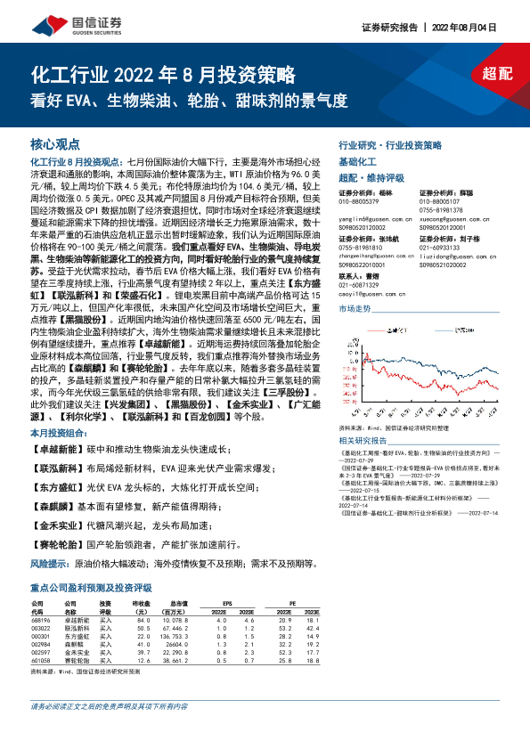 【国信证券】【20220804】化工行业2022年8月投资策略:看好EVA、生物柴油、轮胎、甜味剂的景气度-26页