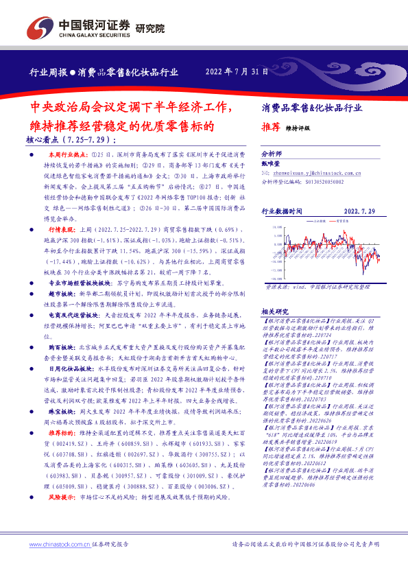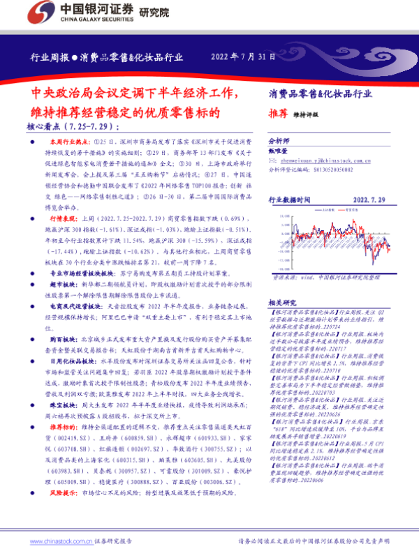 【银河证券】【20220731】20220731-中国银河-消费品零售&化妆品行业行业周报:中央政治局会议定调下半年经济工作,维持推荐经营稳定的优质零售标的-35页