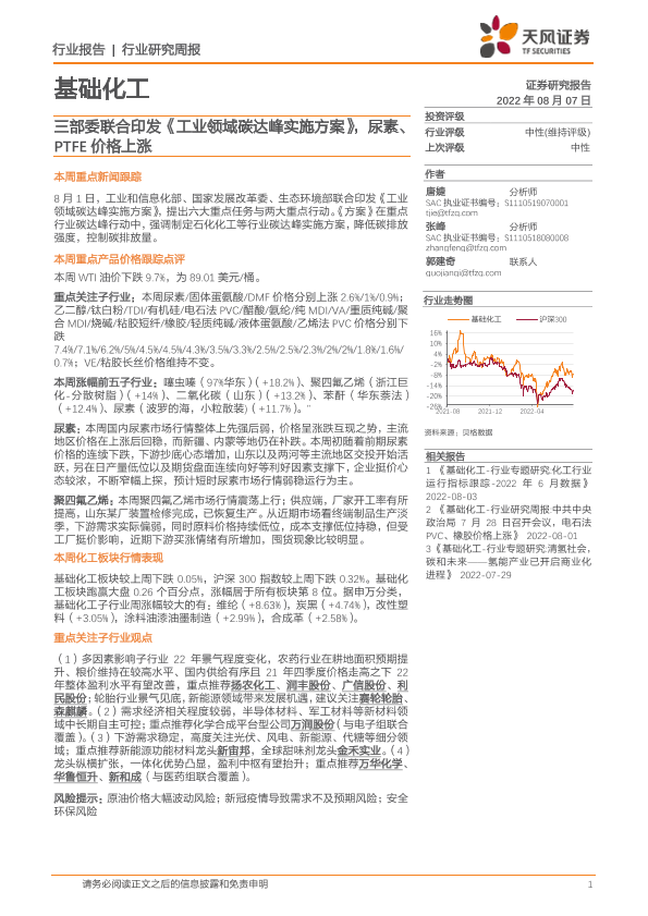 【天风证券】【20220807】基础化工:三部委联合印发《工业领域碳达峰实施方案》,尿素、PTFE价格上涨-21页