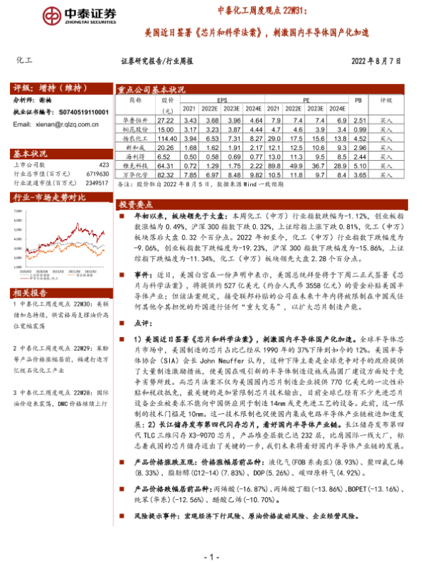 【中泰证券】【20220807】中泰化工周度观点22W31:美国近日签署《芯片和科学法案》,刺激国内半导体国产化加速-26页