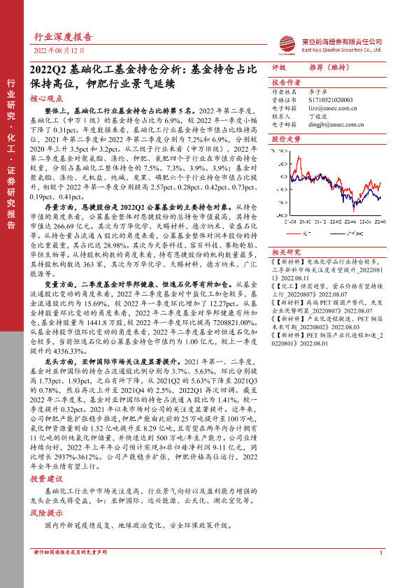 【东亚前海证券】【20220812】2022Q2基础化工基金持仓分析:基金持仓占比保持高位,钾肥行业景气延续-20页