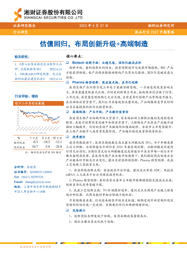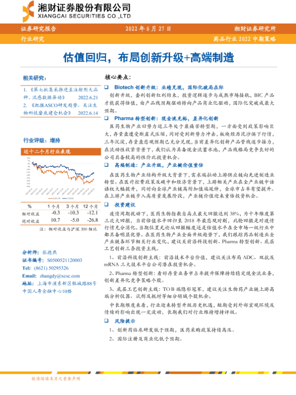【湘财证券】【20220627】药品行业2022中期策略:估值回归,布局创新升级+高端制造-35页