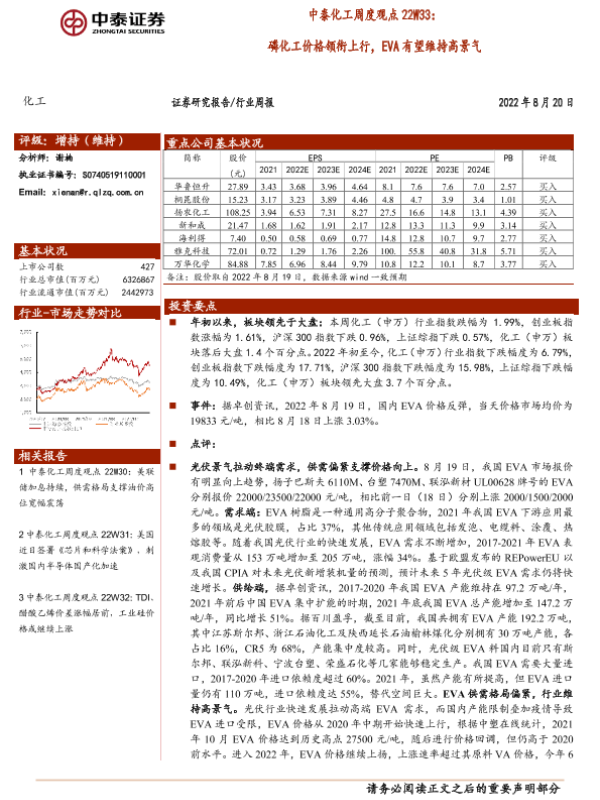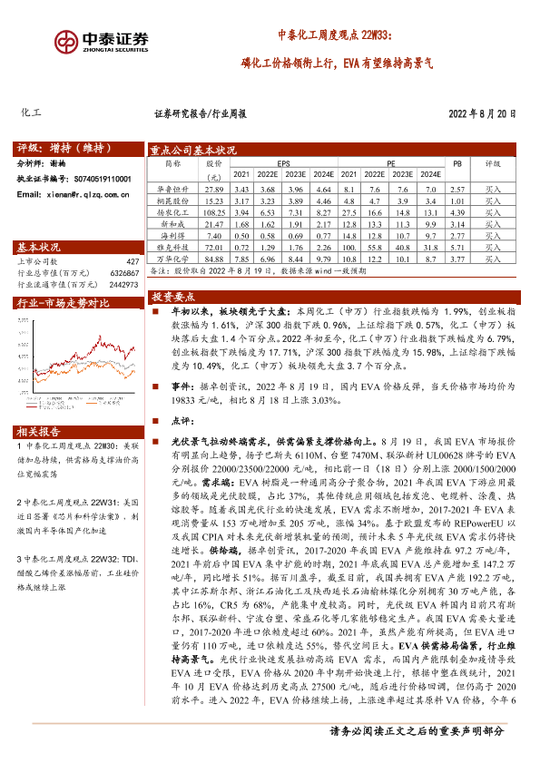 【中泰证券】【20220820】中泰化工周度观点22W33:磷化工价格领衔上行,EVA有望维持高景气-32页