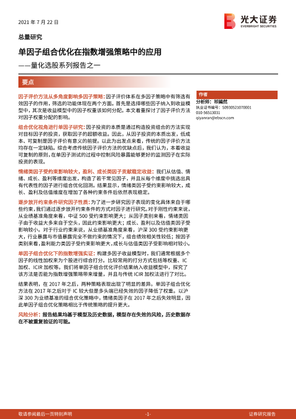 【光大证券】【20210722】量化选股系列报告之一:单因子组合优化在指数增强策略中的应用-29页