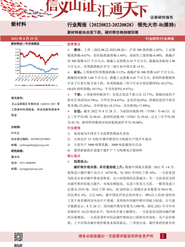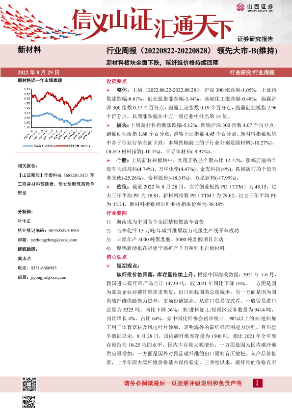 【山西证券】【20220829】新材料行业周报:新材料板块全面下跌,碳纤维价格持续回落-19页