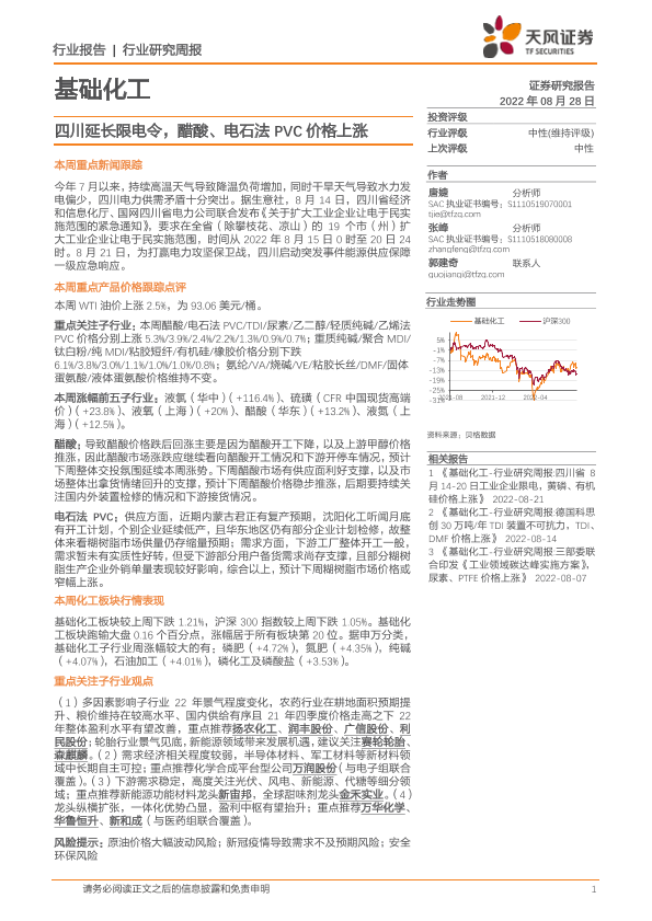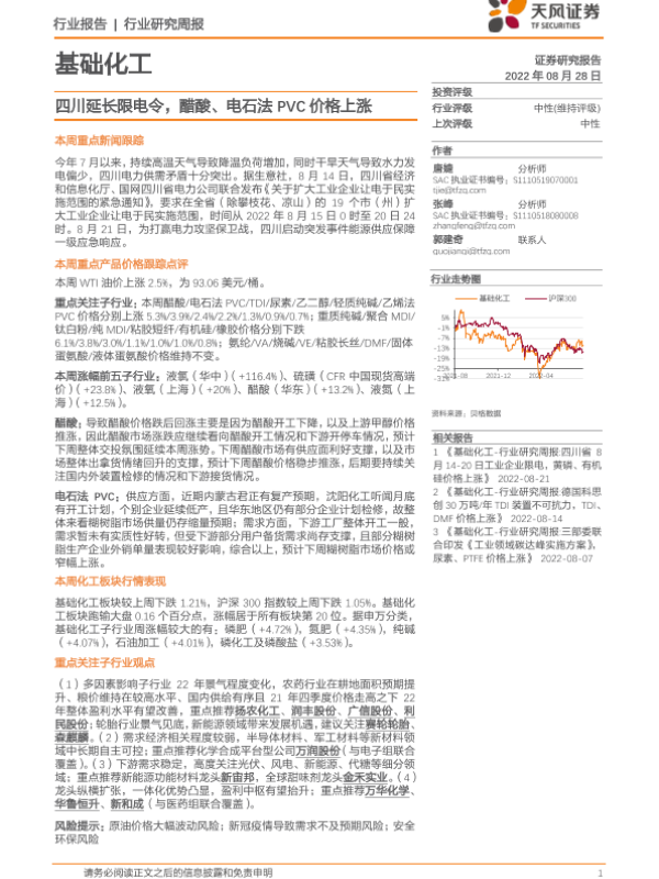 【天风证券】【20220828】基础化工行业研究周报:四川延长限电令,醋酸、电石法PVC价格上涨-21页