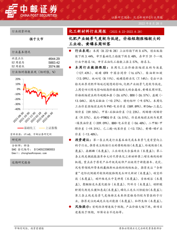 【中邮证券】【20220828】20220828-中邮证券-化工新材料行业周报:化肥产业链景气度较为低迷,价格短期涨幅较大的工业硅、黄磷本周回落-9页