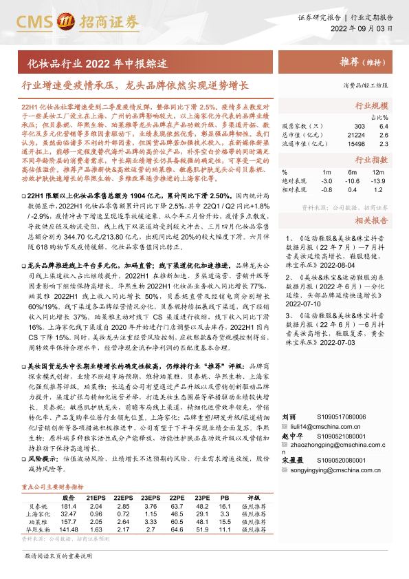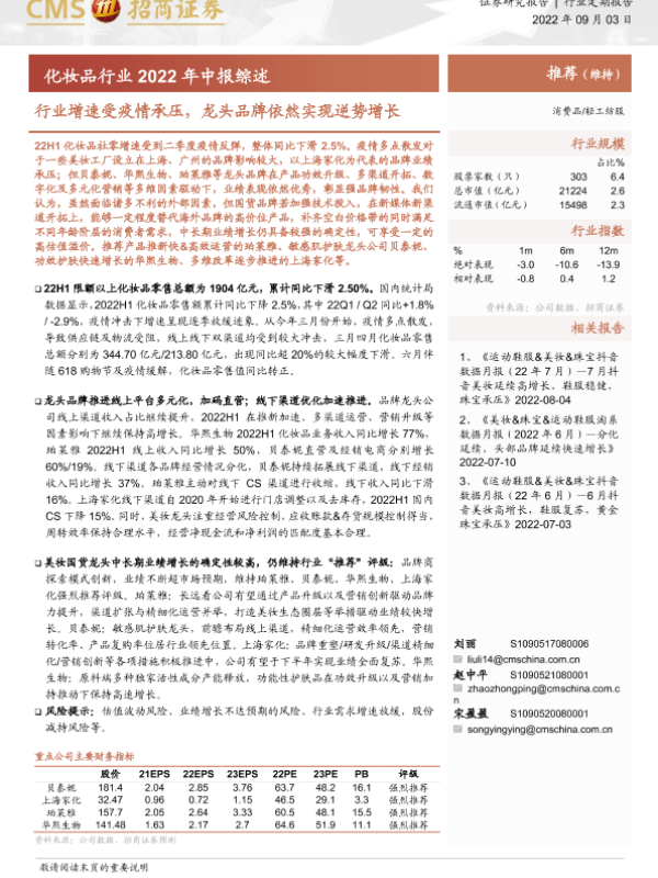 【海通证券】【20220903】化妆品行业2022年中报综述:行业增速受疫情承压,龙头品牌依然实现逆势增长-14页