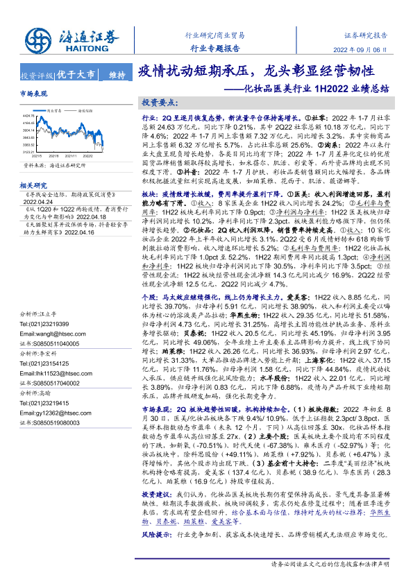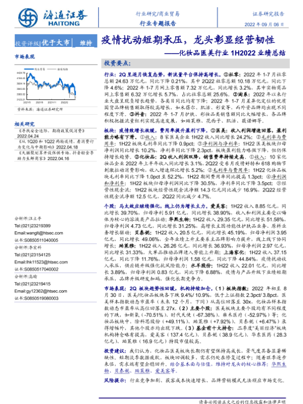 【海通证券】【20220906】化妆品医美行业1H2022业绩总结:疫情扰动短期承压,龙头彰显经营韧性-25页