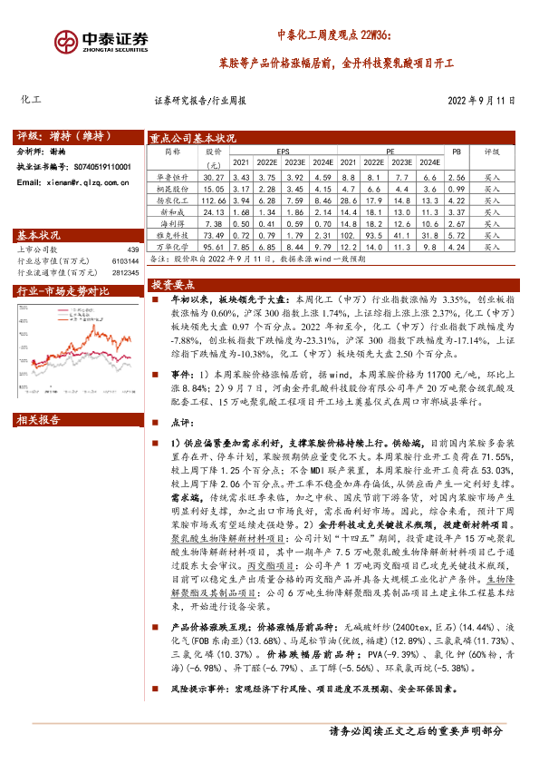 【中泰证券】【20220911】中泰化工周度观点22W36:苯胺等产品价格涨幅居前,金丹科技聚乳酸项目开工-24页