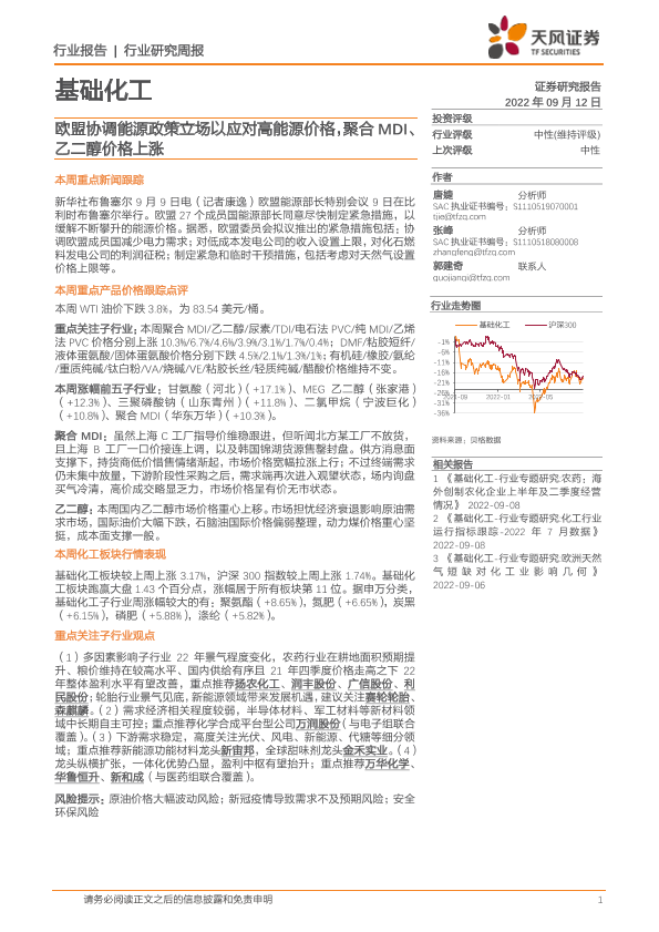 【天风证券】【20220912】基础化工行业研究周报:欧盟协调能源政策立场以应对高能源价格,聚合MDI、乙二醇价格上涨-21页