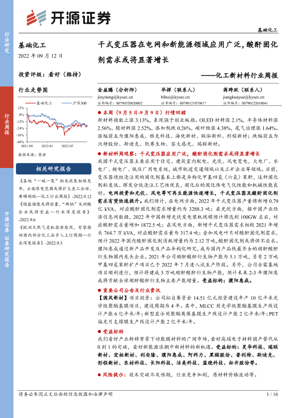 【开源证券】【20220912】化工新材料行业周报:干式变压器在电网和新能源领域应用广泛,酸酐固化剂需求或将显著增长-16页