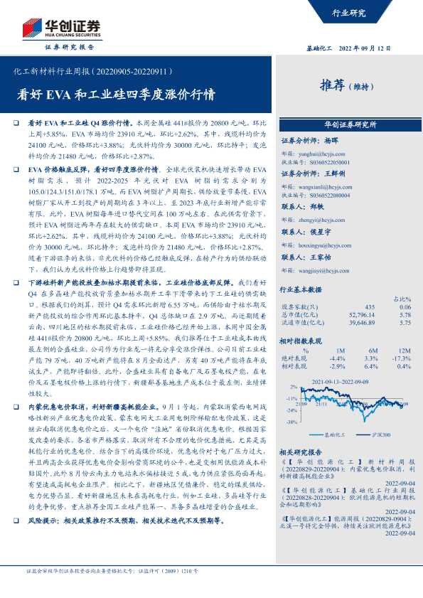 【华创证券】【20220912】20220912-华创证券-化工新材料行业周报:看好EVA和工业硅四季度涨价行情-53页