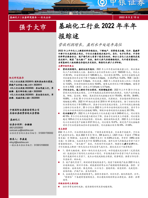 【中银证券】【20220915】基础化工行业2022年半年报综述:营收利润增长,盈利水平处近年高位-21页