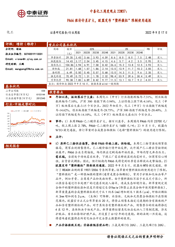 【中泰证券】【20220917】中泰化工周度观点22W37:PA66涨价价差扩大,欧盟发布“塑料微粒”限制使用通报-29页