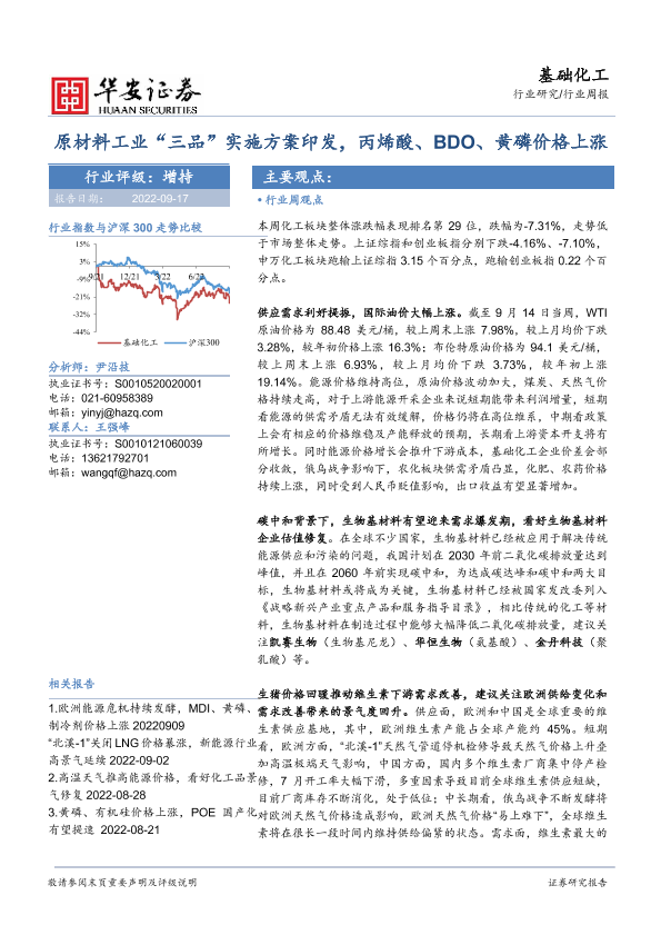【华安证券】【20220917】基础化工行业周报:原材料工业“三品”实施方案印发,丙烯酸、BDO、黄磷价格上涨-44页
