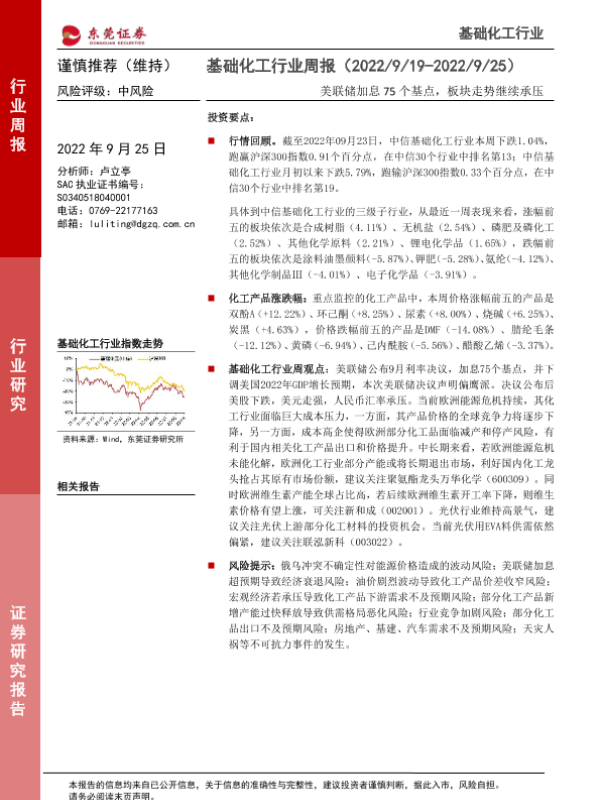 【东莞证券】【20220925】20220925-东莞证券-基础化工行业周报:美联储加息75个基点,板块走势继续承压-12页